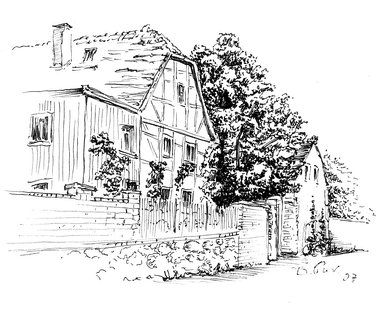Die Zeichnung der Straßenansicht des Dreiseithofes, die wir für unsere Plakate verwenden, wurde 2007 von Barbara Purrucker (1928-2022) angefertigt.